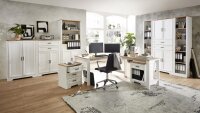 weißer Pinienholz Optik mit Absetzungen in Artisan Eiche wird Ihr neuer Helfer im Arbeitszimmer. Hinter 4 Türen befinden sich insgesamt 4 Fächer mit nützlichem Stauraum, 2 Schubkästen unterstützen dies. So haben Sie genügend Stauraum für diverse Büroartikel. Türen und Schubkästen sind mit einer