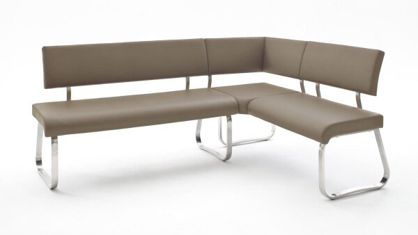 Eckbank, die reichlich Sitzmöglichkeiten zu bieten hat. Ob im Esszimmer oder in der Küche, dieses Möbelstück in Lederlook cappuccino mit Edelstahlgestell findet in jeder modernen Einrichtung einen Platz. Sie haben die Wahl, ob Sie die lange Seite links- oder rechtsseitig montiert haben möchten. Passen Sie die Bank ganz mühelos Ihren Räumlichkeiten an.