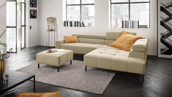Ecksofa CLEVELAND sorgt für den Wow-Faktor in Ihrem Wohnzimmer. Denn mit der hochwertigen PUR-Schaum-Polsterung auf Nosagunterfederung und einem hellen Flachgewebe-Bezug in der Farbe Taupe bietet es großartigen Sitzkomfort in einem attraktiven sowie modernen Look. Die Polsterecke hat ein Stellmaß von ca. 311x219 cm und besteht aus einem 2-Sitzer und einer großen Umbauecke. Damit ist Platz für Gemütlichkeit garantiert. Schwarze Metallbeine mit einem dezenten Twist und eine elegante Steppung verleihen dieser Wohnlandschaft Modernität, während die manuell verstellbaren Kopfstützen den Komfort erhöhen. Für noch mehr Entspannung lässt sich das Sofa mit weiteren Funktionen, wie einem manuellen oder motorischen Sitzvorzug ausstatten. Selbstverständlich erhalten Sie dieses Modell auch in anderen Ausführungen, ob Bezug, Gestell oder Größe.
