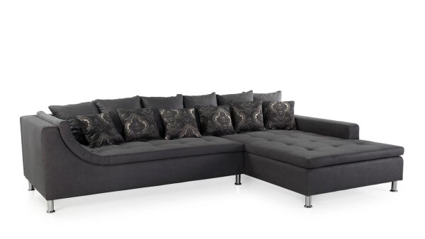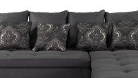 Wohnlandschaft von JOB mit besonderen Steppungen in der Ausführung Microfaser dunkelgrau. Die komfortable Polyätherschaumpolsterung mit hochwertiger Nosagunterfederung lädt Sie zum Entspannen ein. Sechs große Rückenkissen in dunkelgrau und sechs Wendekissen in schwarz-gold sind im Lieferumfang enthalten. Der echt bezogene Rücken ist sehr praktisch und ermöglicht, das Ecksofa frei im Raum zu stellen.