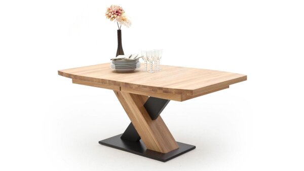 Toller, bootsförmiger Esstisch MENDOZA gefertigt aus massiver Eiche Bianco geölt. Die schwarz lackierte Bodenplatte harmoniert dabei optimal mit der Naturoptik und kreiert ein passendes Gesamtbild. Als Highlight lässt sich der Esszimmertisch dank Synchronauszug von 140 cm auf 220 cm ausziehen.