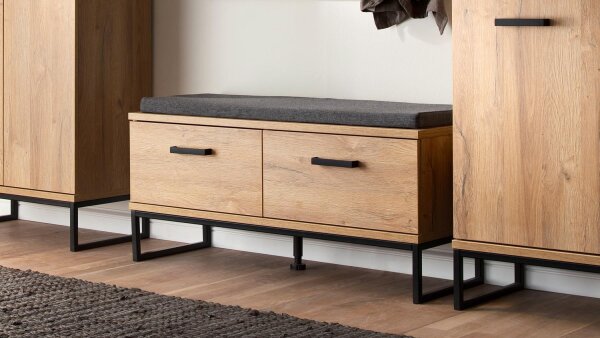 Garderobenbank vereint modernes Design mit natürlichem Charme. Schönes Holzdekor in der Ausführung Grandson Eiche mit hochwertiger Melaminbeschichtung. Die Griffe und das stabile Gestell in schwarz lackiertem Metall sehen sehr elegant aus und ergeben einen wunderbaren Kontrast. In den zwei Klappen finden Sie viel Platz für verschiedene Utensilien.