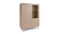 Dieses schöne Highboard BALI besticht durch den schicken skandinavischen Stil, welcher vor allem durch die stabilen Massivholzfüße und dem modernen Design zur Geltung kommt. Die 103 cm breite Anrichte bietet mit zwei Türen, vier Einlegeböden und zwei Schubkästen sehr viel Platz für Utensilien oder Dekoration. Als optisches Highlight gilt der Bastgeflecht-Look, welcher der Front einen einzigartigen Charme verleiht.