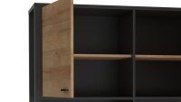 Highboard HIGH ROCK hat ein besonderes Flair und bietet dazu eine Menge Stauraum für Ihr Wohn- oder Esszimmer. Der stilvolle Schrank bietet Platz für Geschirr, Gläser, Bücher sowie Order und wirkt dabei keinesfalls wuchtig oder langweilig. Er hat ein offenes Design mit zweifarbiger Gestaltung in Riviera Eiche Nachbildung und schwarzen Elementen aus Dekor und Metall, das der modernen Optik eine industrielle Note einfließen lässt. Die geschlossenen Flächer hinter den 4 Türen werden in der Horizontalen durch zwei offene Fächer separiert. Diese setzen sich kontrastreich von den Fronten ab und lassen das elegante Möbelstück luftiger wirken. Nutzen Sie diesen Platz für Deko-Objekte oder Fotorahmen.