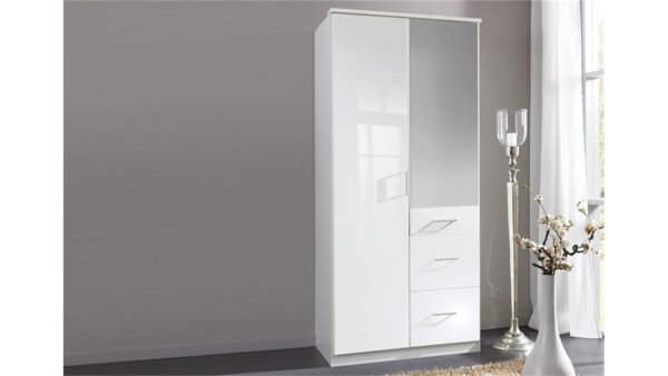 Kleiderschrank Clack in Alpinweiß mit weißen Hochglanzfronten und Spiegel 90 cm breit