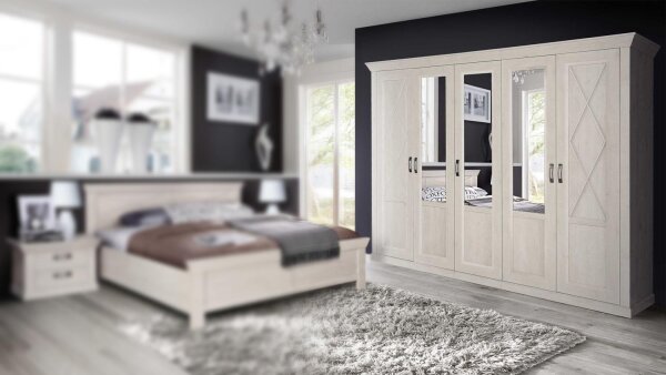 KASHMIR in Pinie weiß fällt durch seine detailliert bearbeitete Oberfläche auf. Die erhellende Farbe breitet sich sofort in Ihrem Schlafzimmer aus und erschafft eine angenehme Atmosphäre. Der Schlafzimmerschrank mit einer Breite von 255 cm und einer Höhe von 220 cm hat hinter seinen zwei Holz- und drei Spiegeltüren eine sehr geräumige Inneneinteilung. Weitere Möbel aus diesem Möbelprogramm finden Sie in unserem Onlineshop.