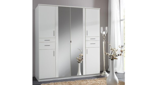 Drehtürenschrank in der Farbe weiß bietet Ihnen jede Menge Stauraum dank eines vielseitigen Ordnungssystems. Textilien und Kleidungsstücke sind perfekt sortiert und übersichtlich verstaut. Das absolute Highlight ist das integrierte Accessoire-Fach, ideal für Ihre liebsten Schmuckstücke. Dank des großflächigen Ganzkörperspiegels ist Ihr Schlaf- und Ankleidezimmer perfekt ausgestattet und erhält sogar mehr Helligkeit und optische Weite.