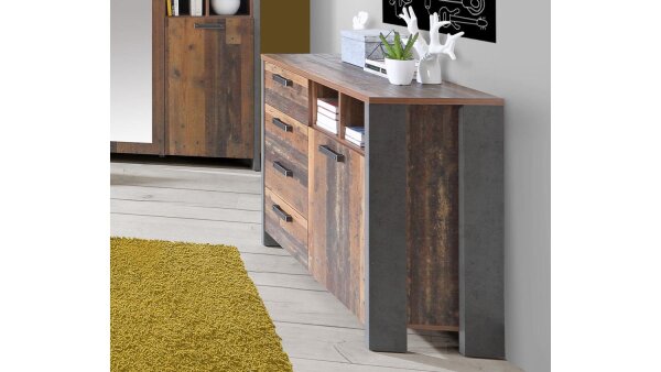old wood vintage und Betonoptik an. Ausgestattet mit vier Schubkästen, zwei offenen Fächern und einem Boden bietet die Anrichte zudem reichlich Stauraum für Ihre Utensilien an. Weitere schöne Möbel von Forte finden Sie in unserem günstigen Shop.
