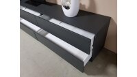 Kommode aus dem Programm Bright in der Farbausführung graphit. Die Kommode ist mit zwei praktischen Schubkästen inklusive push-to-open Funktion ausgestattet, hinter denen Sie reichlich Platz für Ihre Utensilien haben.
