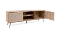 Mit diesem natürlichen Lowboard BALI in Sonoma Eiche Rafia wird Ihnen eine moderne Stauraumergänzung für Ihr Wohnzimmer geboten. Hinter zwei Türen und dank zwei offenen Fächern, können Receiver, Konsole oder andere Utensilien problemlos untergebracht werden. Das 150 cm breite TV-Board punktet mit einer schönen Bastgeflecht-Optik und stabilen Massivholzfüßen.