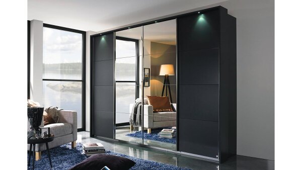 Schlafzimmerschrank Syncrono von Rauch Orange aus. Elegantes Dekor in der Ausführung grau-metallic und Griffleisten in Chromoptik sorgen für ein wunderschönes Ambiente im Schlafzimmer. Hinter den Synchron-Türen bietet der Schwebetürenschrank mit einer Gesamtlänge von 271 cm zudem genügend Platz für Ihre gesamte Kleidung. Eine nützliche Innenausstattung ist nämlich inklusive und bietet neben Schubkasteneinsätzen und Stoffkisten auch weitere Böden und Kleiderstangen.