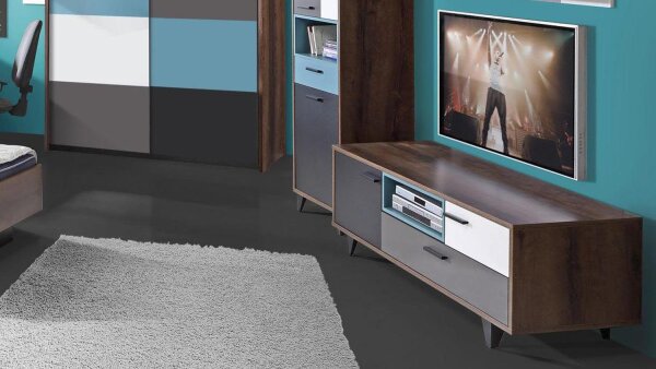 TV-Board mit 2 Schubkästen, 1 Fach und 1 Tür sieht gut aus und bietet viel Stauraum. Die Form, die Farben Schlammeiche, weiß, grau und grün machen diesen Unterschrank zu einem Blickfang in jedem Jugendzimmer. Kinderzimmer und Flurmöbel aus dem Programm