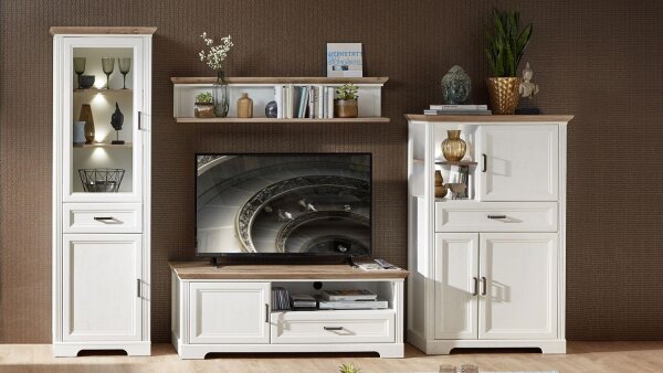 Mit der Wohnwand 1 JASMIN bringen Sie eine frische Atmosphäre in Ihre Wohnung. Die Anbauwand im schönen Landhausstil fällt mit seiner traumhaften Farbkombination Pinie hell und Artisan Eiche sowie seines Designs und seiner LED-Beleuchtung sofort auf. Das hier angebotene 4-Teilige Set mit Softclose und Selbsteinzug besteht aus einer Vitrine, einem Stauraumelement, einem Wandboard und einem TV-Board. Erweitern Sie diese Wohnlösung mit den dazu passenden Beimöbeln, die Sie ebenfalls in usnerem Shop bestellen können.