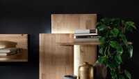 Balkeneiche Bianco massiv mit geölter Oberfläche verleihen Sie Ihrem Wohnraum ein natürliches Ambiente. Mit gedämpften Türen und Schubkästen, stabilen Metallgriffen und furnierten Rückwänden bietet die Anbauwand viele besondere Merkmale. Gegen Aufpreis erhalten Sie die stimmungsvolle LED-Beleuchtung, mit der Sie Dekoobjekte hinter den Glaseinsätzen perfekt in Szene setzen.