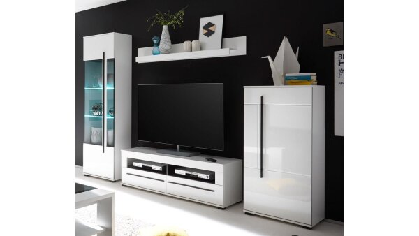 Mit einer hellen und frischen Optik lässt diese Wohnwand mit Fronten in weiß Hochglanz Ihr Wohnzimmer in neuem Glanz erstrahlen. Das besondere sind die schönen schwarzen Griffe und Absetzungen, die nicht nur einen schönen Kontrast bieten sondern auch das Möbelstück edel und elegant wirken lassen. Die Vitrine hat eine schöne große Glasfront, um Vasen, Bilder oder andere Objekte zu platzieren. Gegen Mehrpreis ist zusätzlich eine LED-Glaskantenbeleuchtung erhältlich, dass ein schönes indirektes Licht zaubert und Highlights setzt.