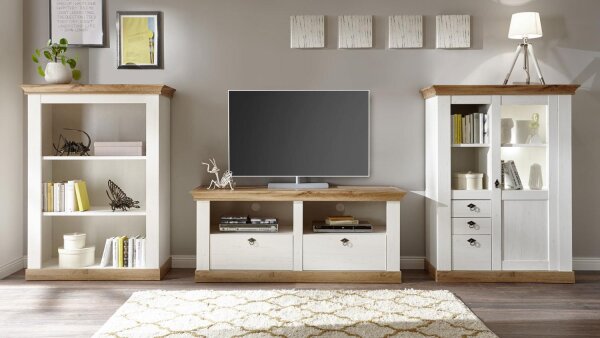 Mit einer Vitrine, einem Lowboard und einem Regal überzeugt diese 3-teilige Wohnwand LANDHAUS in Pinie weiß und Wotan Eiche. Das Design im klassischen Landhausstil verleiht Ihren Räumlichkeiten eine angenehme Stimmung. Die drei Möbel, welche in diesem Set enthalten sind, bieten mit Türen, Fächern und Schubkästen ausreichend Platz um verschiedene Utensilien zu verstauen. Metallgriffe fügen sich stimmig in das Gesamtbild ein und geben der schönen Anbauwand den letzten Feinschliff. Ein absolutes Muss, für Leute, die den ländlichen Stil genießen.