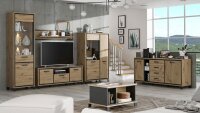 Wohnwand TRONDHEIM weht ein industrieller Einrichtungsstil mit moderner Note durch Ihr Wohnzimmer. Das 4-teilige Set aus Artisan Eiche Dekor und Schwarzeiche Nachbildung kombiniert den gemütlichen Holzlook mit der Feinheit von Glas und bezaubert damit Anhänger des Industrie Designs. Schlanke Metallgriffe und -füße in Schwarz runden den Gesamteindruck gekonnt ab. Das harmonische Ensemble besteht aus einer Säulenvitrine, einer Highboardvitrine, einem TV-Board für den TV- und HiFi-Geräte sowie einem Wandregal und bietet dem Raum mit einer Stellfläche von 344 cm ausreichend Stauraum für alles, was Sie im Wohnzimmer benötigen.